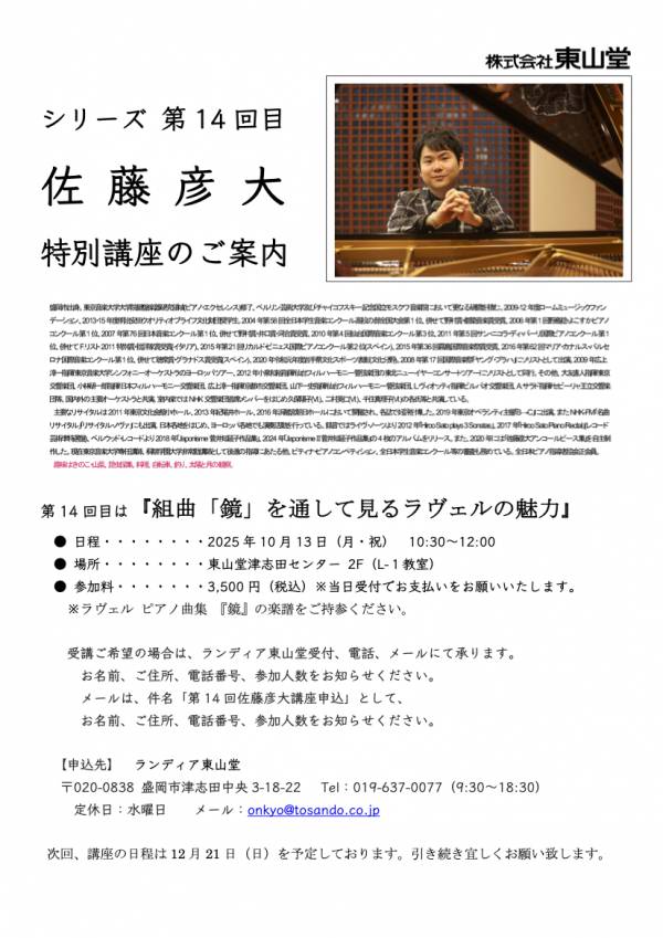 佐藤彦大先生の特別講座のご案内です。第14回目は『組曲「鏡」を通して見るラヴェルの魅力』です。お申し込みは、店頭、電話、メールで受け付けます。ご希望の方は下記連絡先までお申し込み下さい。メールの方は、件名に「第14回佐藤彦大講座申込」本文に「氏名、連絡先、参加人数」をご記入ください。皆様からのお申し込みをお待ちしております。